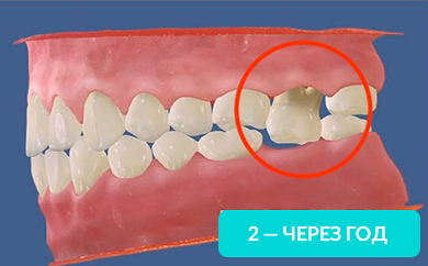 Через год изменения уже будут видны невооруженным глазом. Выдвинутый зуб будет мешать при протезировании противоположного. Придется подпиливать выдвинувшийся зуб или возвращать его на место с помощью ортоимплантов.
