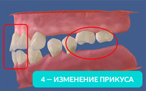 Массовое смещение и выдвижение оставшихся зубов приводит к нарушению прикуса. На 4-ой картинке видно, что положение центральных зубов достаточно ощутимо изменилось, при этом удаленные зубы были расположены далеко от них.